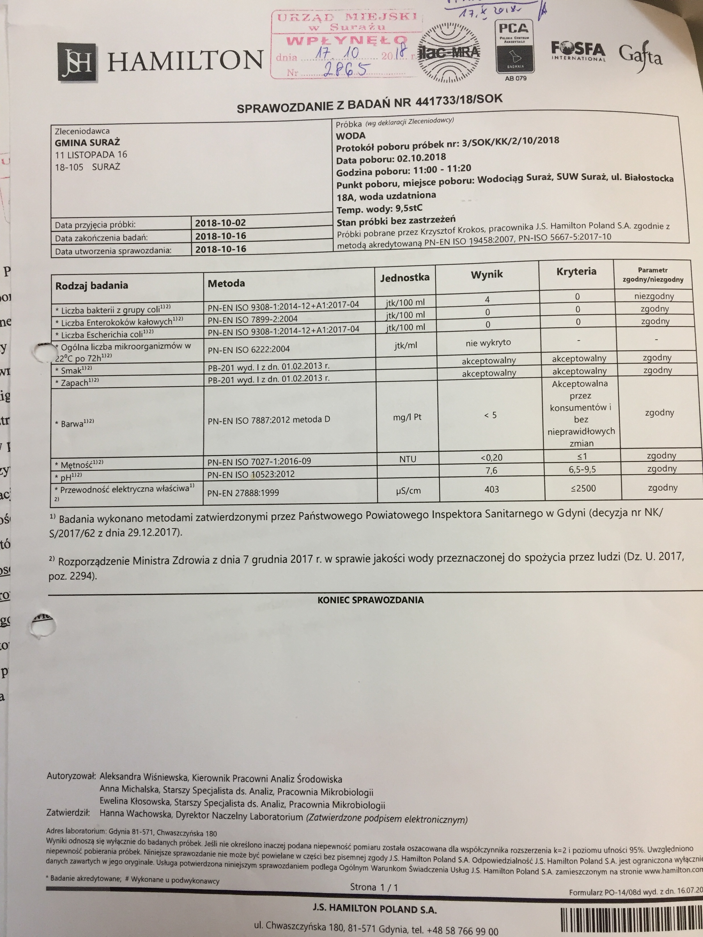 Badania wody z dnia 16.10.2018 r.