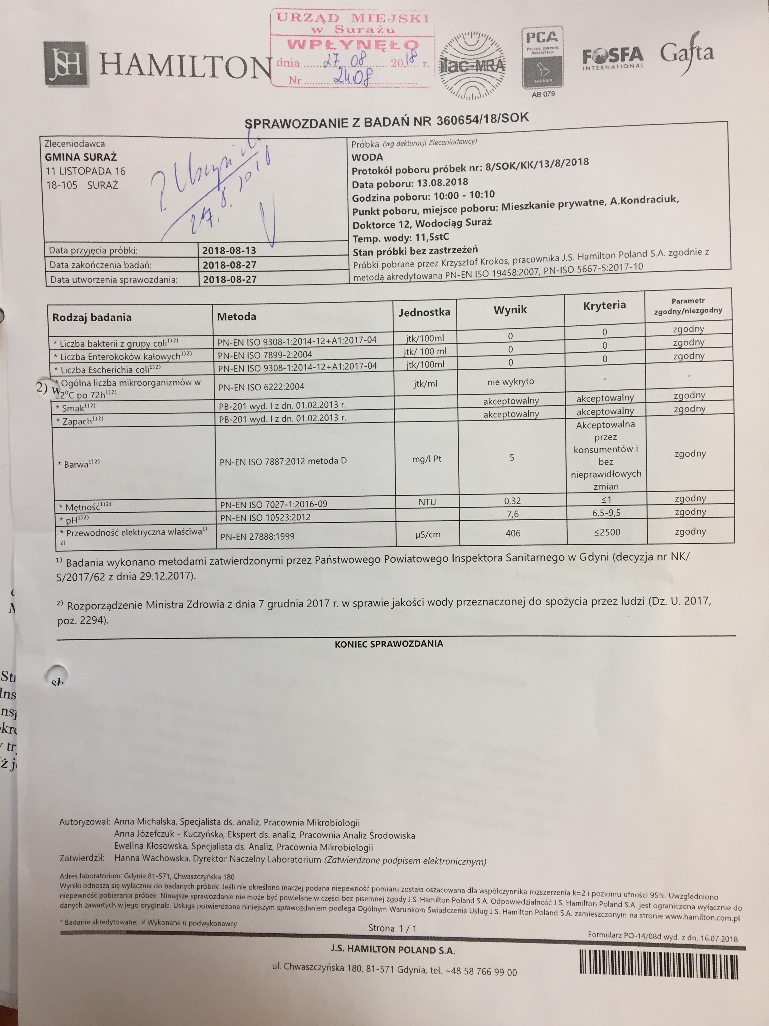 Badania wody z dnia 27.08.2018 r.