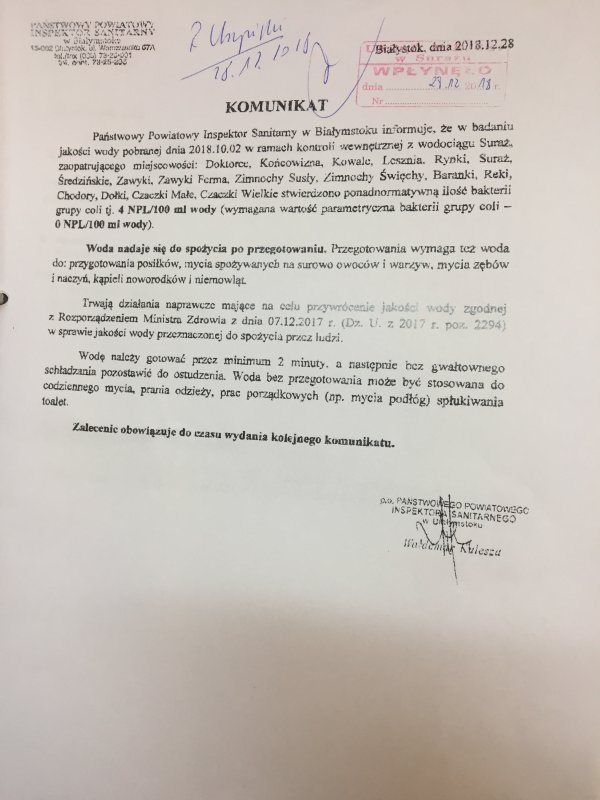 Komunikat w sprawie jakości wody z dnia 28.12.2018 r.
