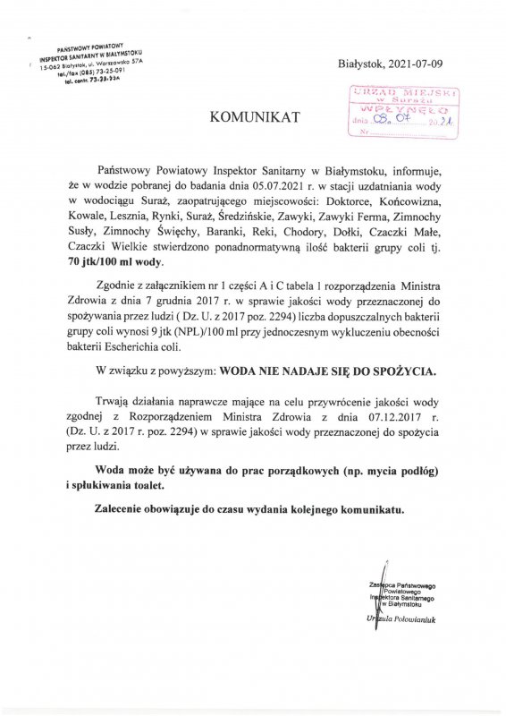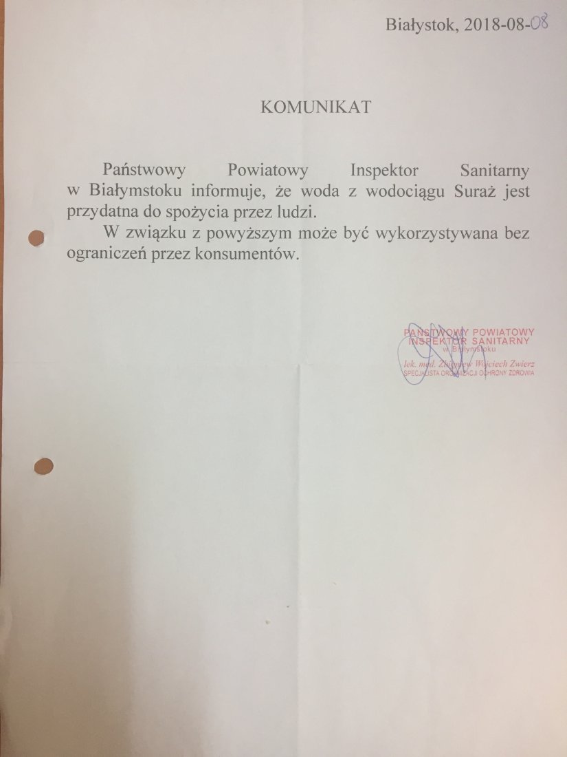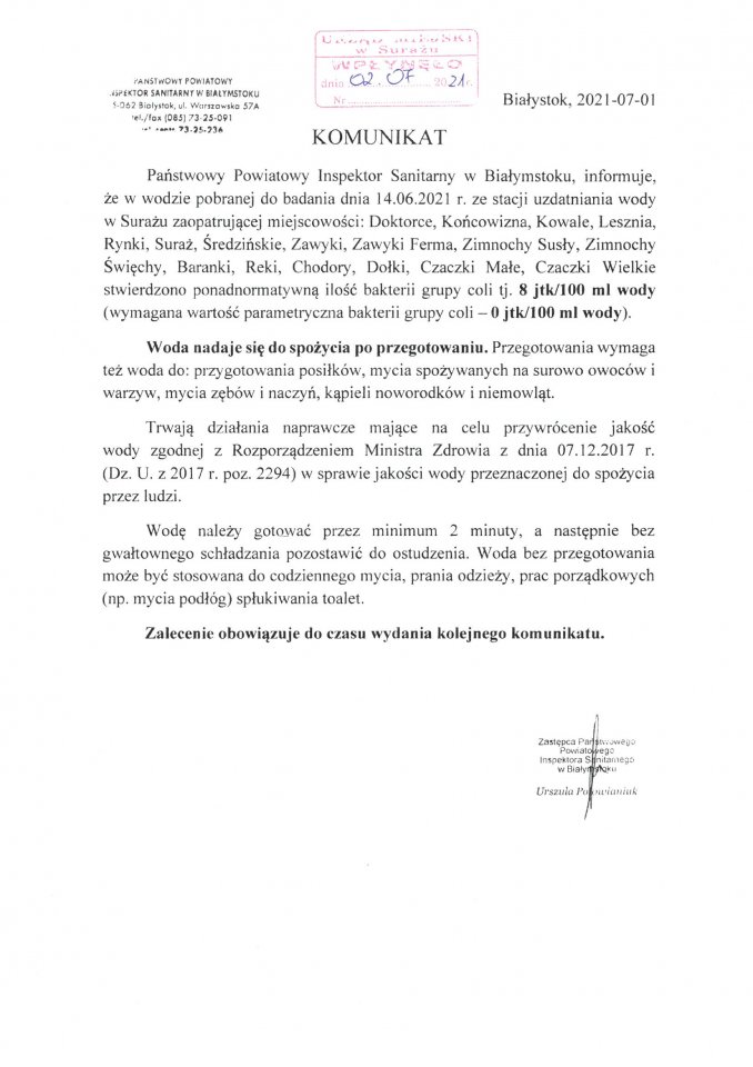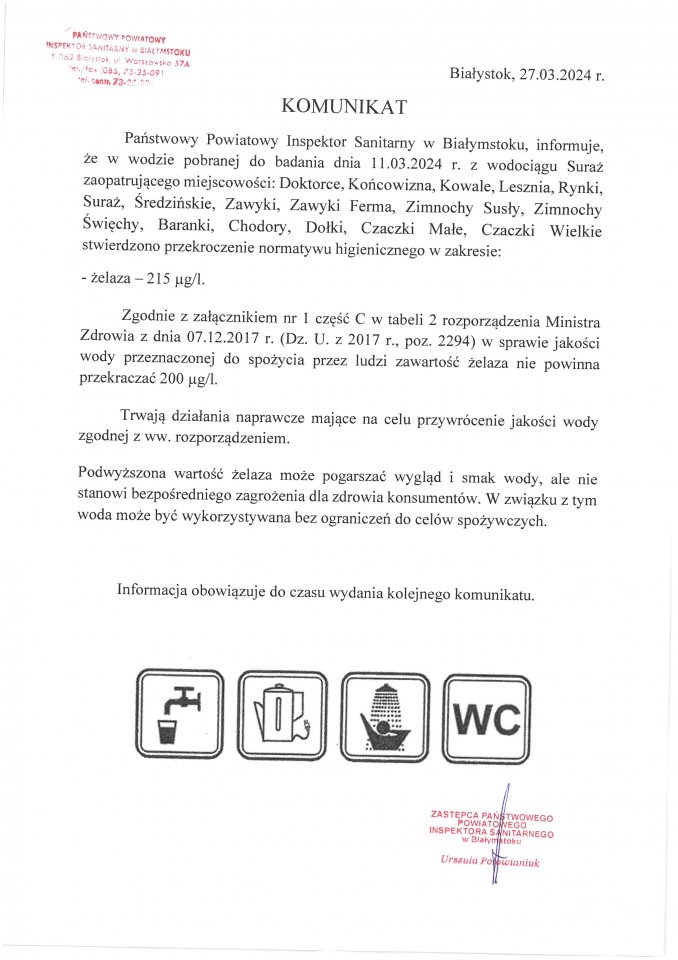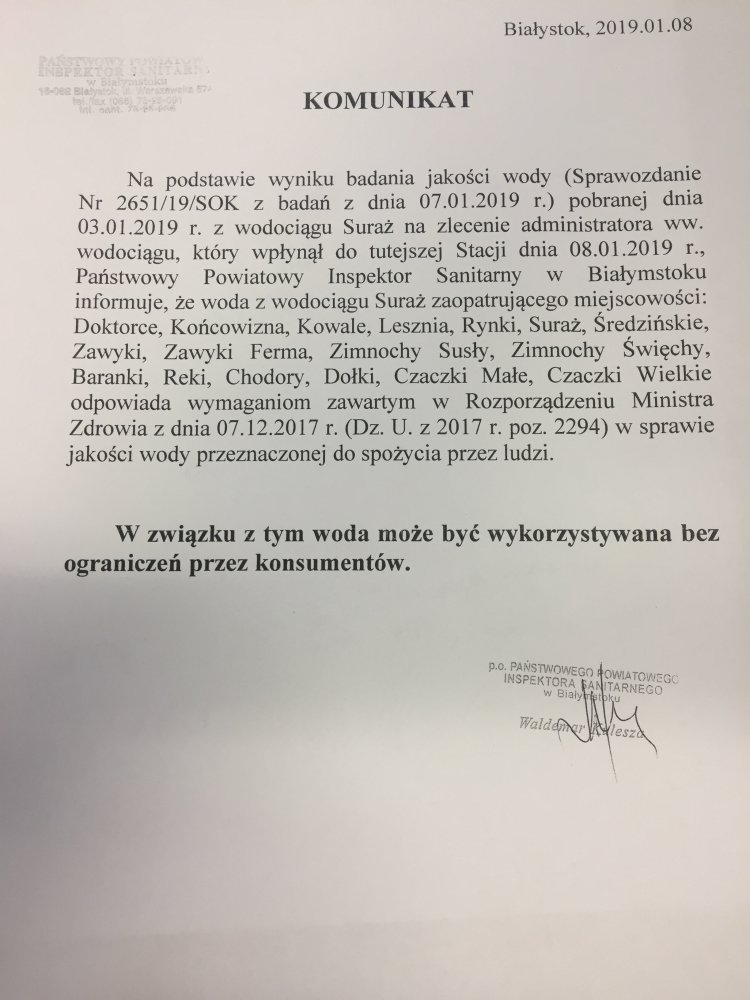 KOMUNIKAT W SPRAWIE WODY Z WODOCIĄGU SURAŻ