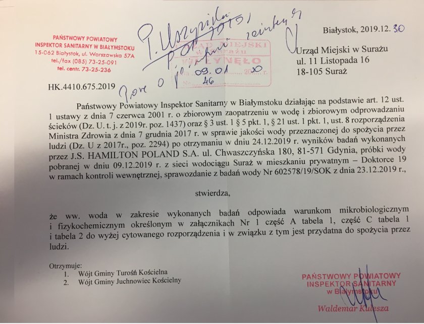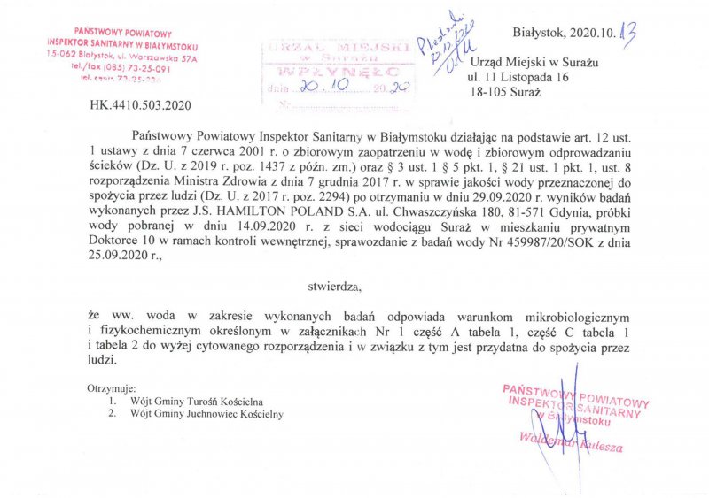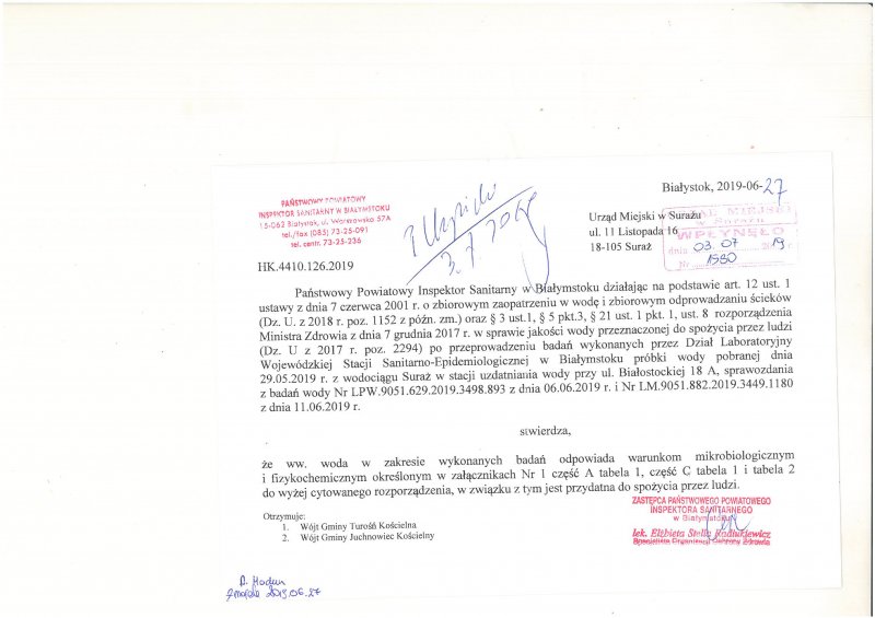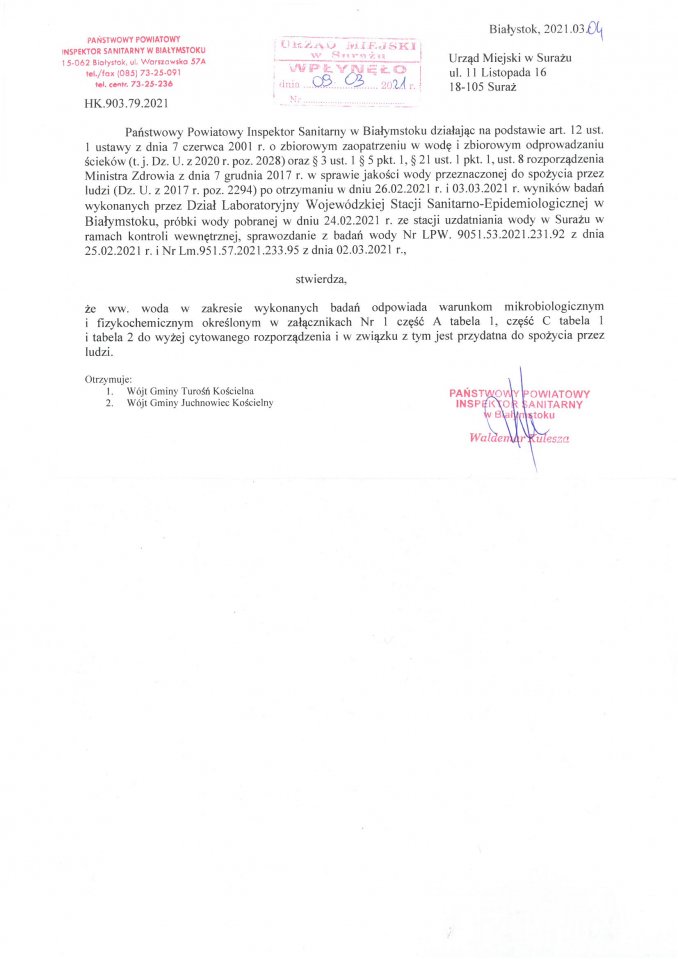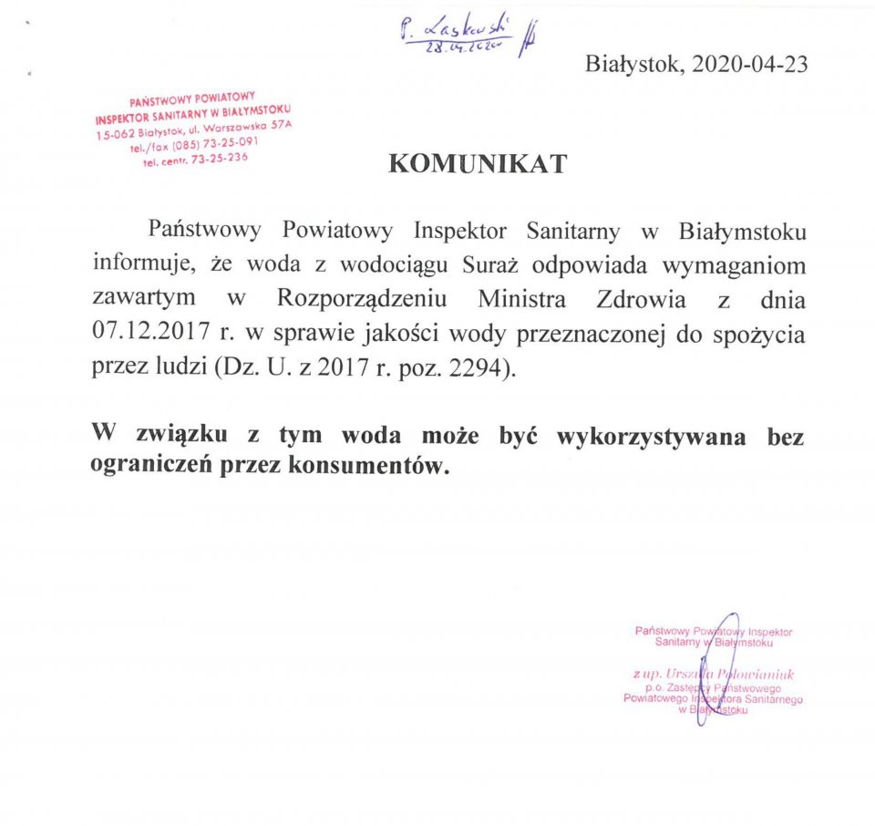 KOMUNIKAT W SPRAWIE WODY Z WODOCIĄGU SURAŻ