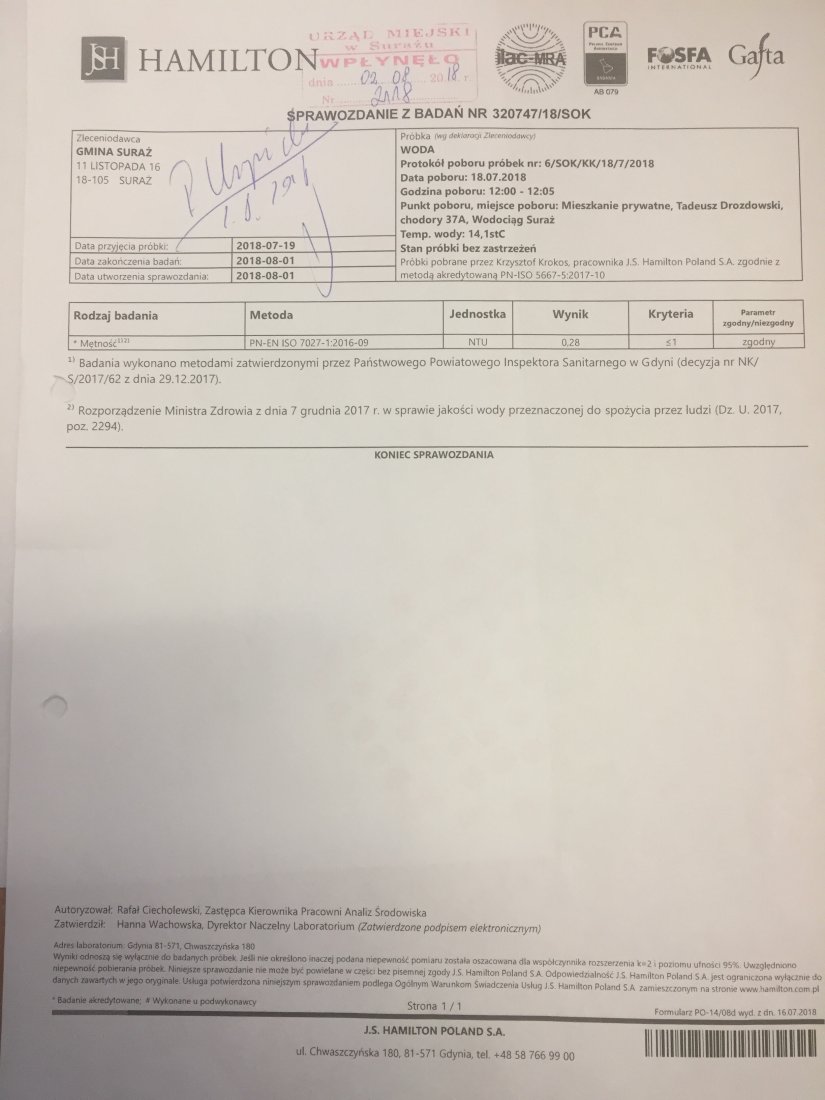 Badania wody z dnia 01.08.2018 r.