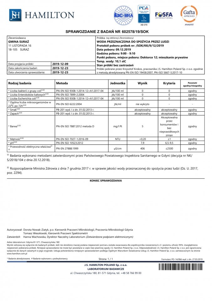 Wyniki badań wody z dnia 23.12.2019 r.