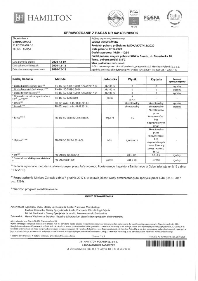 Wyniki badań wody z dnia 18.12.2020