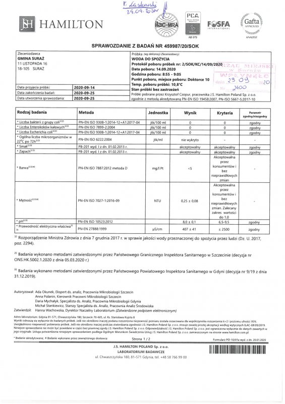 Wyniki badań wody z dnia 25.09.2020