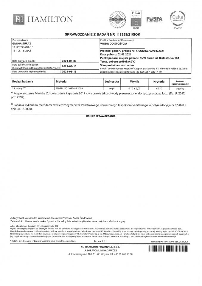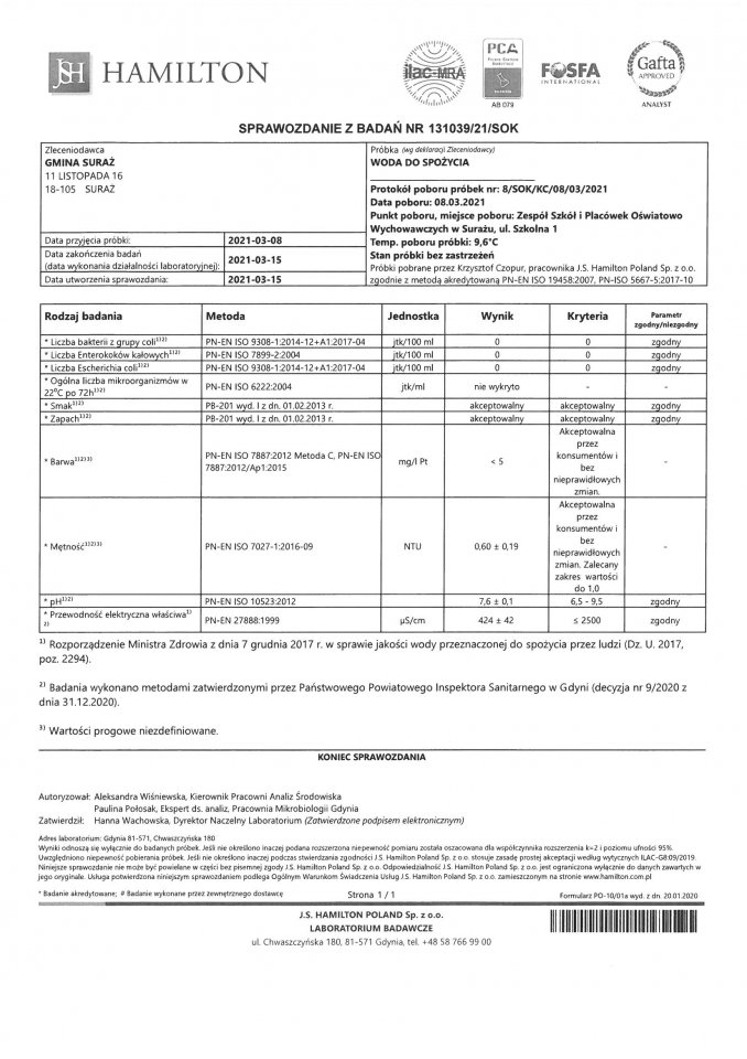 Wyniki badań wody z dnia 15.03.2021