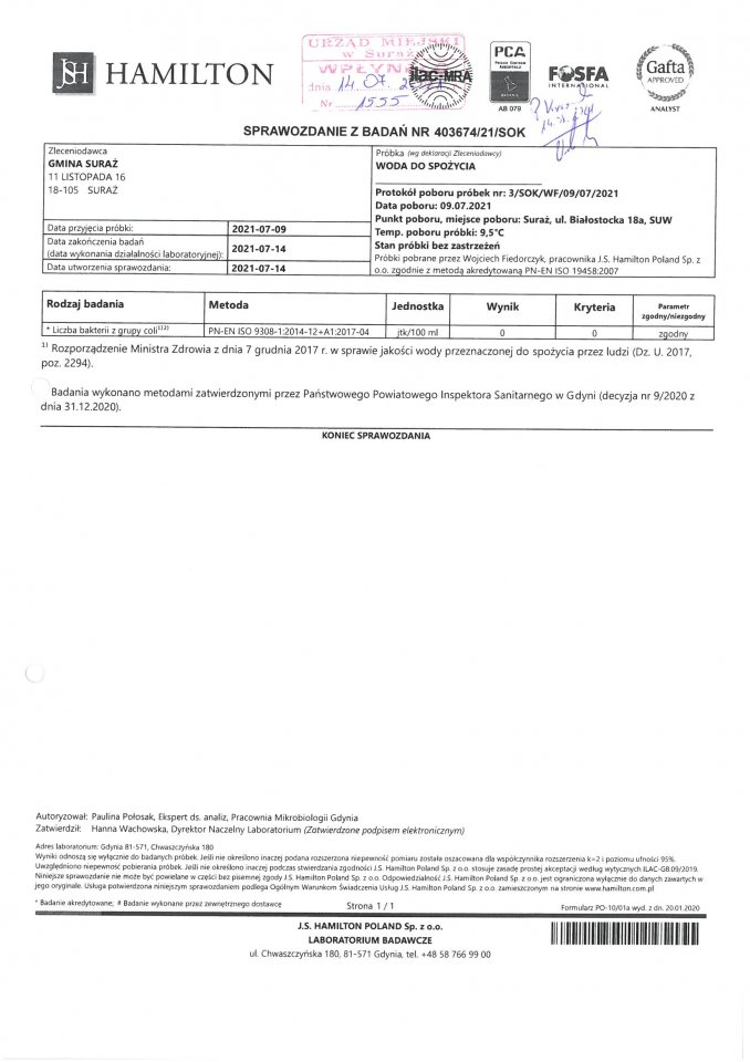 Wyniki badań wody z dnia 14.07.2021