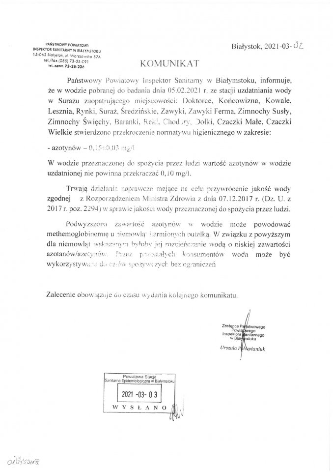 Komunikat w sprawie jakości wody z dnia 02.03.2021