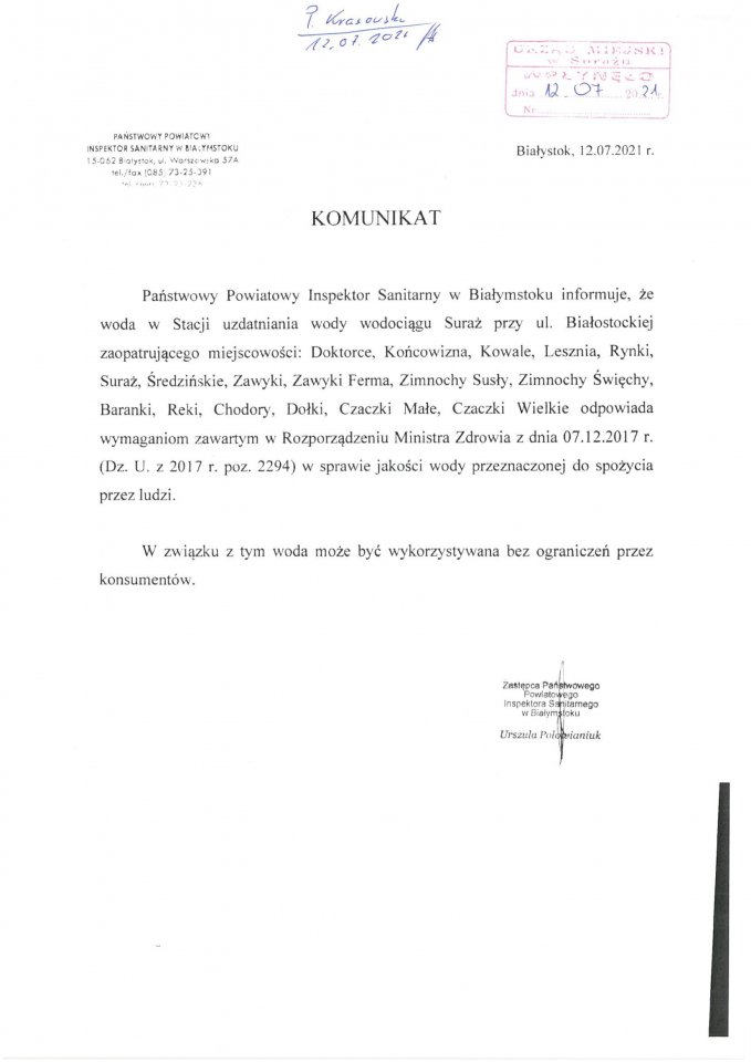 Komunikat w sprawie jakości wody z dnia 12.07.2021