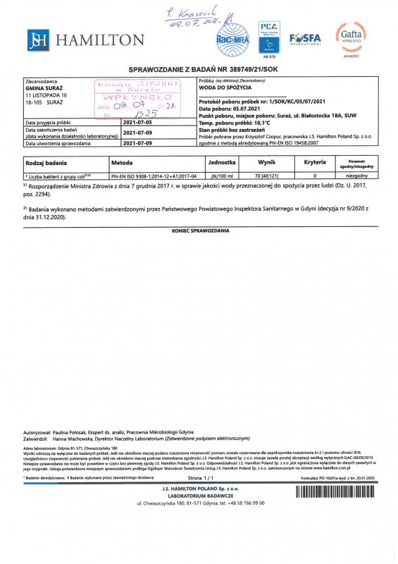 Wyniki badań wody z dnia 12.07.2021